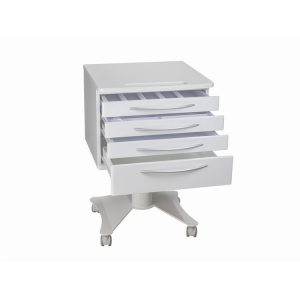 El carrito móvil Contiene 4 ruedas y 4 cajones, está fabricado en acero lacado en blanco.