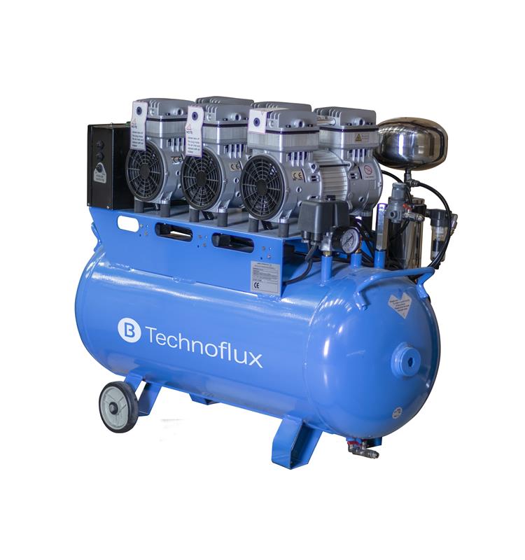 El compresor DA7003D de Technoflux es un compresor con 70 litros de capacidad, tres cabezales de seis cilindros y una potencia de 2,25 hp. Incluye un temporizador para retraso en el arranque del tercer cabezal y es ideal para 3-5 equipos.