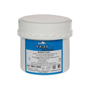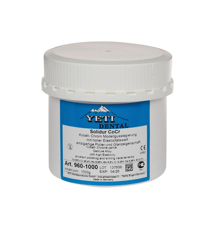 La aleación para esqueléticos dura muelle de cromo-cobalto Solibond N de Yeti Dental posee unas excelentes propiedades. Gracias a su capa de óxido muy fina es de elaboración rápida. De alta precisión, con unas propiedades de pulido y brillo únicos. Alta biocompatibilidad. Ofrece la posibilidad de inducción por láser. Gracias a sus excelentes características físicas permite la realización de construcciones esbeltas. Durabilidad en boca. Intervalo de fusión: 1.360ºC – 1.410º C. Temperatura de colado: 1.470ºC. Dureza vickers 420 Hv. Coeficiente de dilatación 6,5 % Coeficiente de resistencia a rotura 8% El envase de Solidur R aleación CR-CO de Yeti Dental está disponible en: 1 bote de 1 kg. pack de 3 botes de 1 kg cada uno.CARACTERÍSTICAS Aleación de Cromo-Cobalto. Para esqueléticos dura muelle. Excelente fluidez de la fusión. Reproducción de los detalles muy finos. Pulido y brillo únicos. Capa de óxido muy fina, elaboración rápida. Posibilidad de inducción por láser. Durabilidad en boca. Alta biocompatibilidad. Intervalo Fusión: 1.360 – 1.410º C.